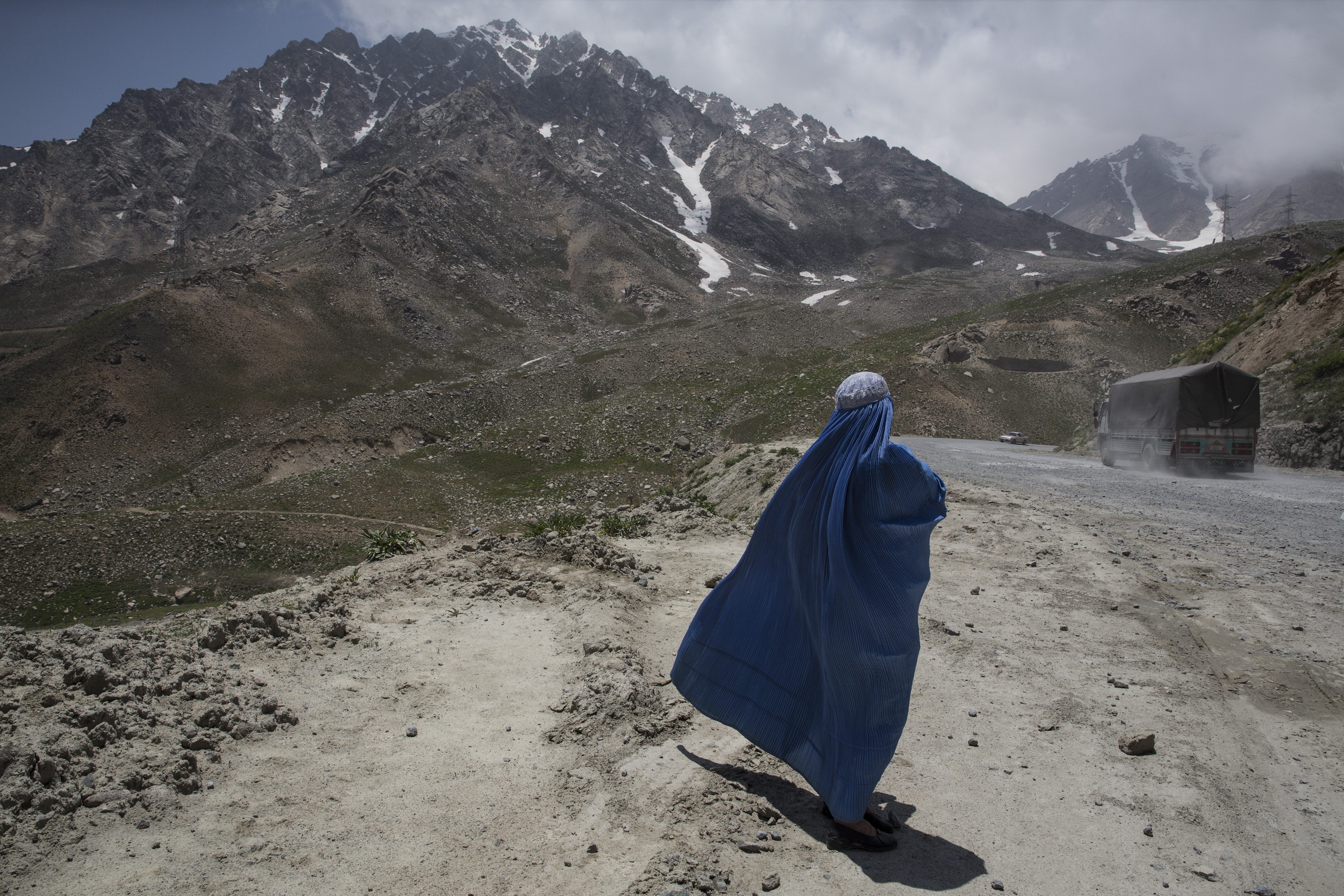 An Afghan woman in a burqa near Salang Tunnel, Hindu Kush mountains.