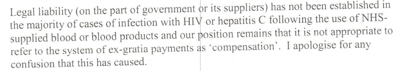 If MPs or new campaigners ever wrote to government accidently referring to these ex -gratia payments as compensation, they would be politely reprimanded in writing that the government would never use this word as to use it would be to admit liability.