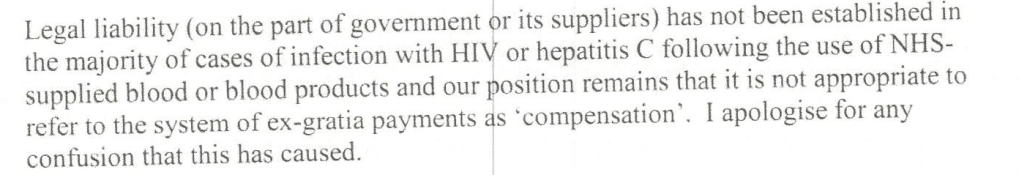 This author once received an apology from Jeremy Hunt (former Secretary of State for Health) after he used the word compensation to refer to ex-gratia payments and I asked if government was now accepting liability.