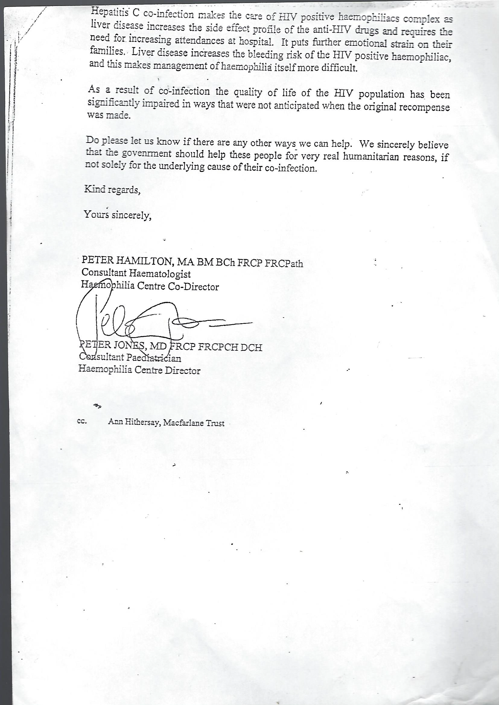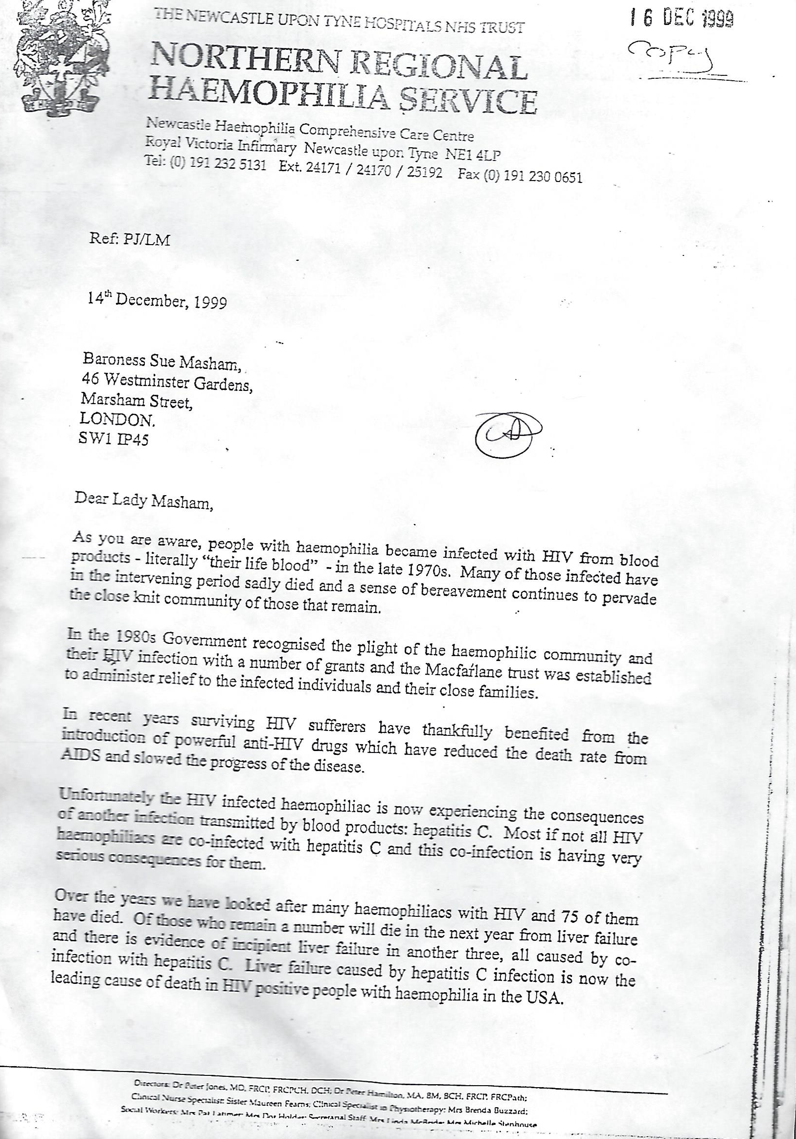 In 1999, Dr Peter Jones and Dr Peter Hamilton wrote the following letter to Baroness Masham which the Newcastle Haemophilia Centre shared with campaigners as follows:-