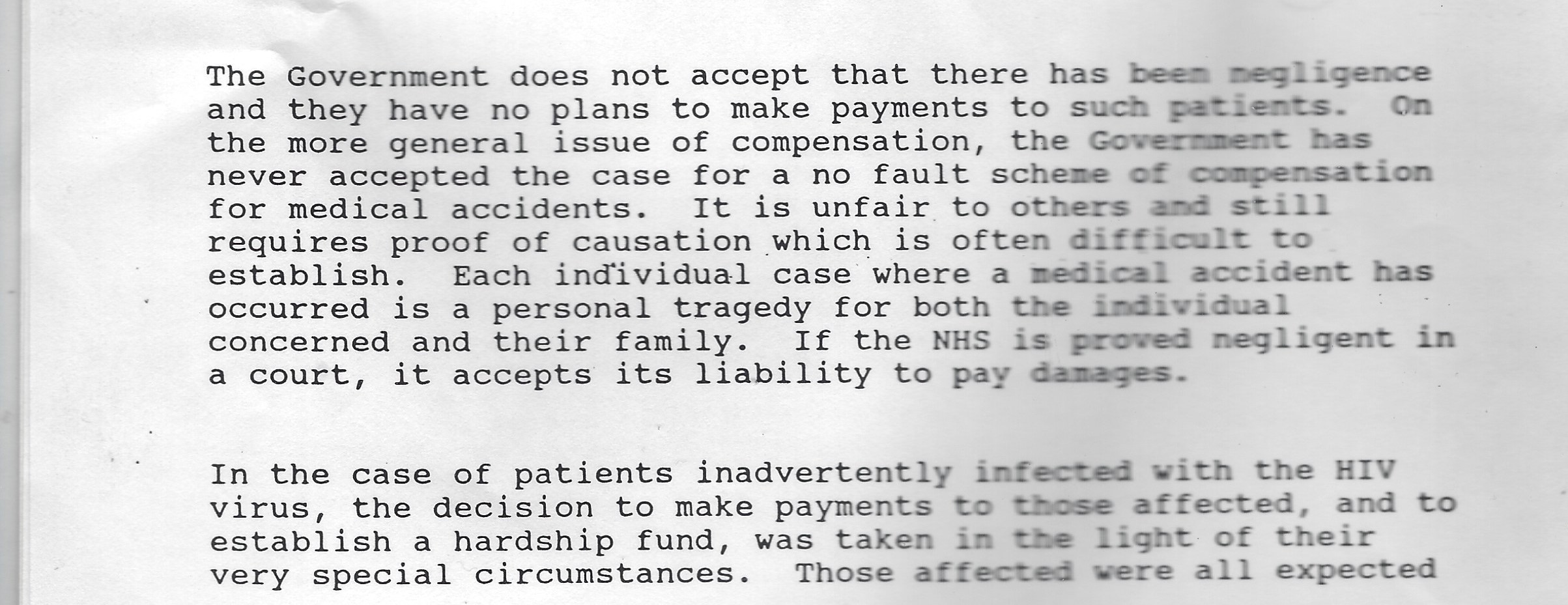 In 1996, I called once more for, “compensation on a parity with Eire” government refused again. Leonard Levy, NHS Executive Department of Health wrote to me referring to the infection of haemophiliacs as a “medical accident” and “inadvertent infection”.