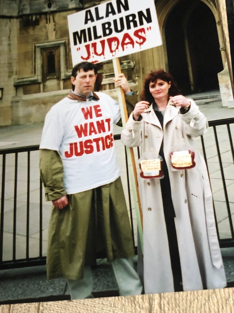 Colette Wintle, a female haemophiliac who has campaigned for decades for truth, justice and compensation pictured with her husband Steve who has joined her on many demonstrations, supporting her giving evidence at 3 inquiries