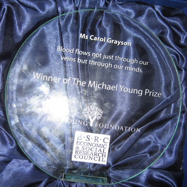 Carol Grayson was awarded the ESRC Michael Young Prize for her research dissertation on Contaminated Blood written in 2005/6