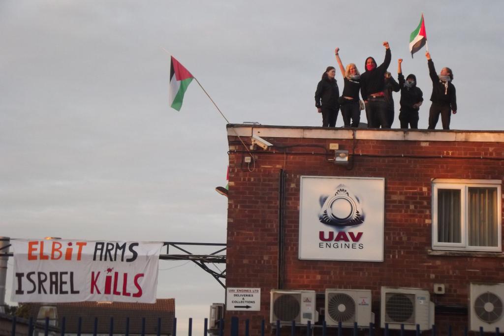 London Palestine Action, a network of people in London taking creative action against Israeli apartheid through Boycott, Divestment and Sanctions (BDS) began a roof-top protest at Shenstone, Staffordshire where parts are produced for military drones. Activists shut down a factory, calling on the British government to “Stop Arming Israel” from UAV Engines Ltd and for bosses to be arrested. They claim that drone engines manufactured at the factory have been exported to Israel in 2010, 2011 and 2012.